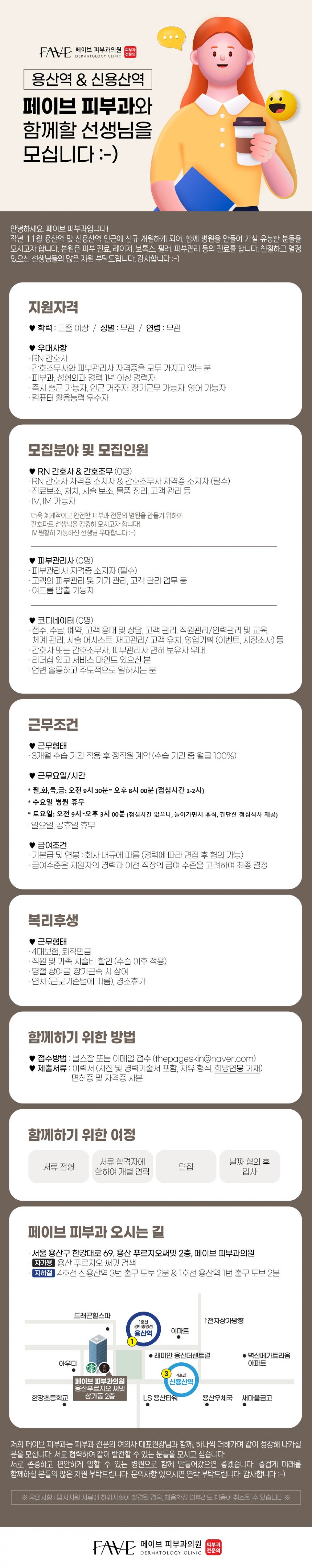 본 정보는 페이브피부과의원에서 제공한 자료를 바탕으로 뷰티인잡에서 편집 및 그 표현방법을 수정하여 완성한 것입니다. 본 정보는 뷰티인잡의 동의없이 무단전재 또는 재배포, 재가공할 수 없으며, 게재된 채용기업과 채용담당자의 정보는 구직활동 이외의 용도로 사용할 수 없습니다. 뷰티인잡의 동의없이 무단전재, 재배포, 재가공, 구직활동 이외의 용도로 사용 시 형사 및 민사 법적 책임이 있을 수 있습니다. 뷰티인잡은 페이브피부과의원에서 게재한 자료에 대한 오류와 사용자가 이를 신뢰하여 취한 조치에 대한 책임을 지지 않습니다.