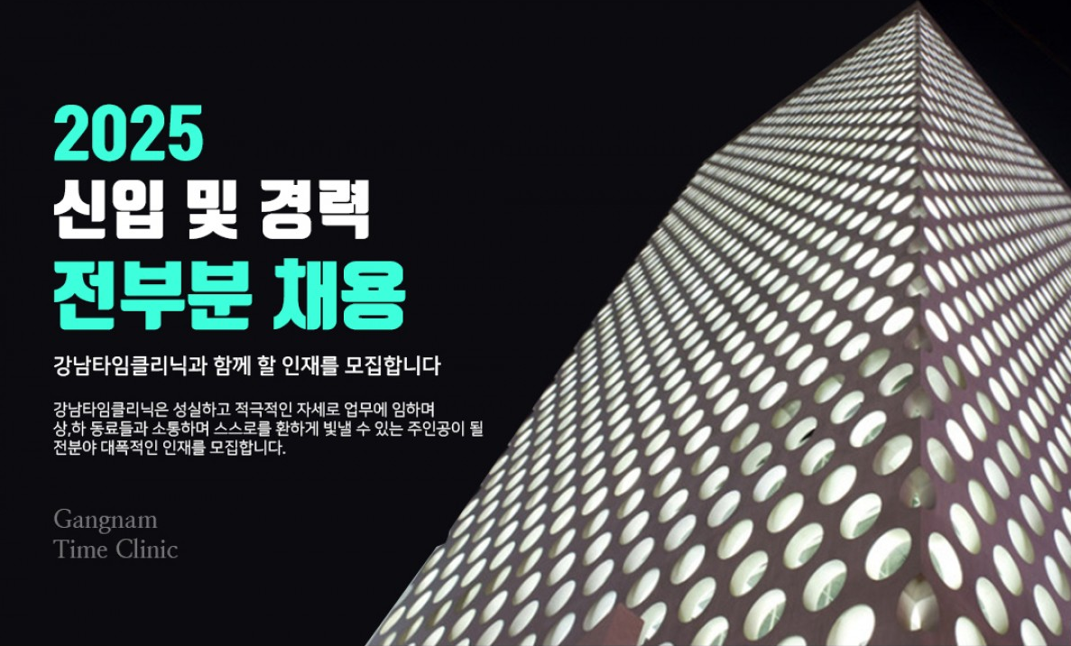 본 정보는 강남타임의원에서 제공한 자료를 바탕으로 뷰티인잡에서 편집 및 그 표현방법을 수정하여 완성한 것입니다. 본 정보는 뷰티인잡의 동의없이 무단전재 또는 재배포, 재가공할 수 없으며, 게재된 채용기업과 채용담당자의 정보는 구직활동 이외의 용도로 사용할 수 없습니다. 뷰티인잡의 동의없이 무단전재, 재배포, 재가공, 구직활동 이외의 용도로 사용 시 형사 및 민사 법적 책임이 있을 수 있습니다. 뷰티인잡은 강남타임의원에서 게재한 자료에 대한 오류와 사용자가 이를 신뢰하여 취한 조치에 대한 책임을 지지 않습니다.