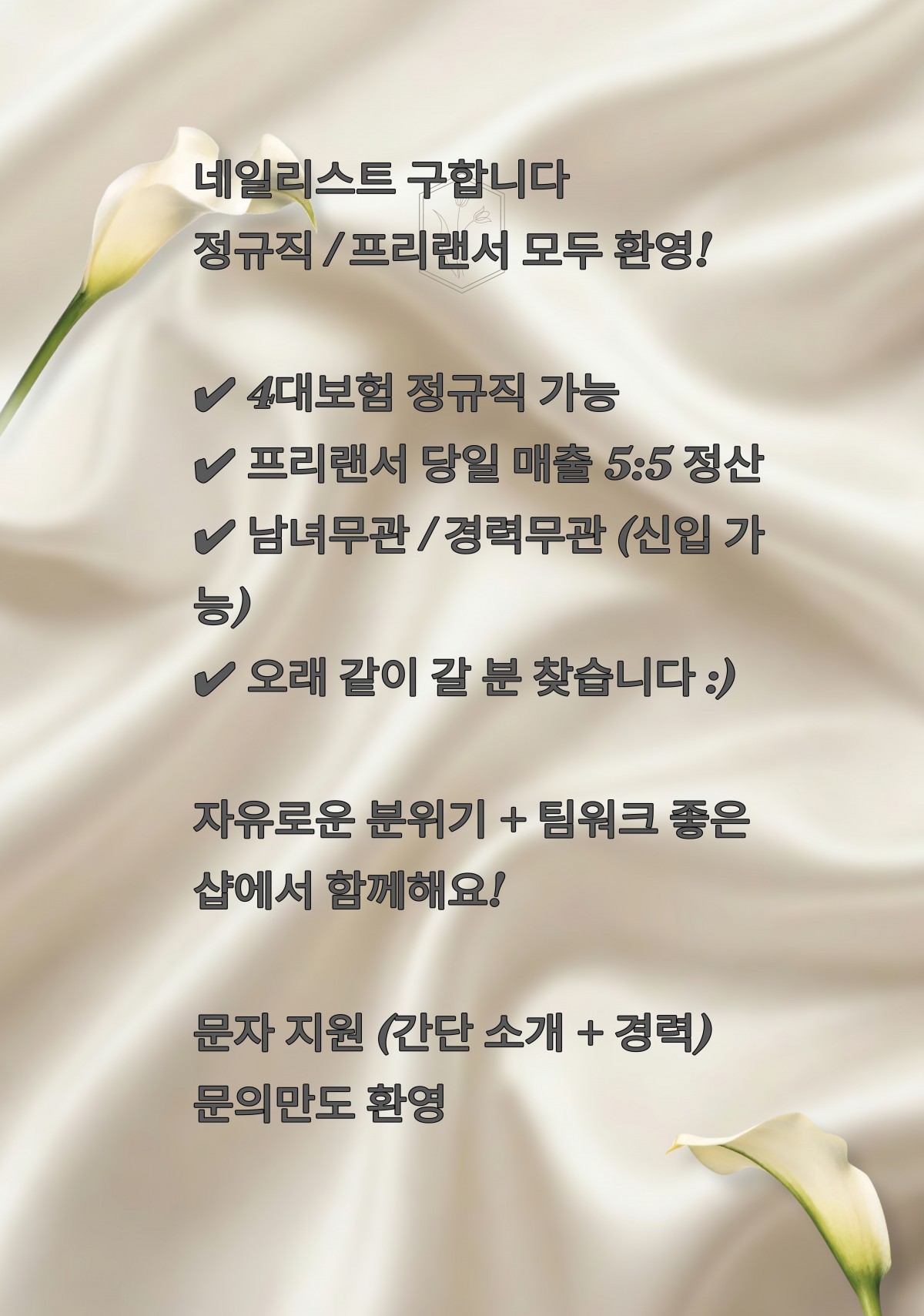문의 시 “뷰티인잡 보고 연락드렸습니다”라고 말씀해 주시면 보다 빠른 안내가 가능합니다.