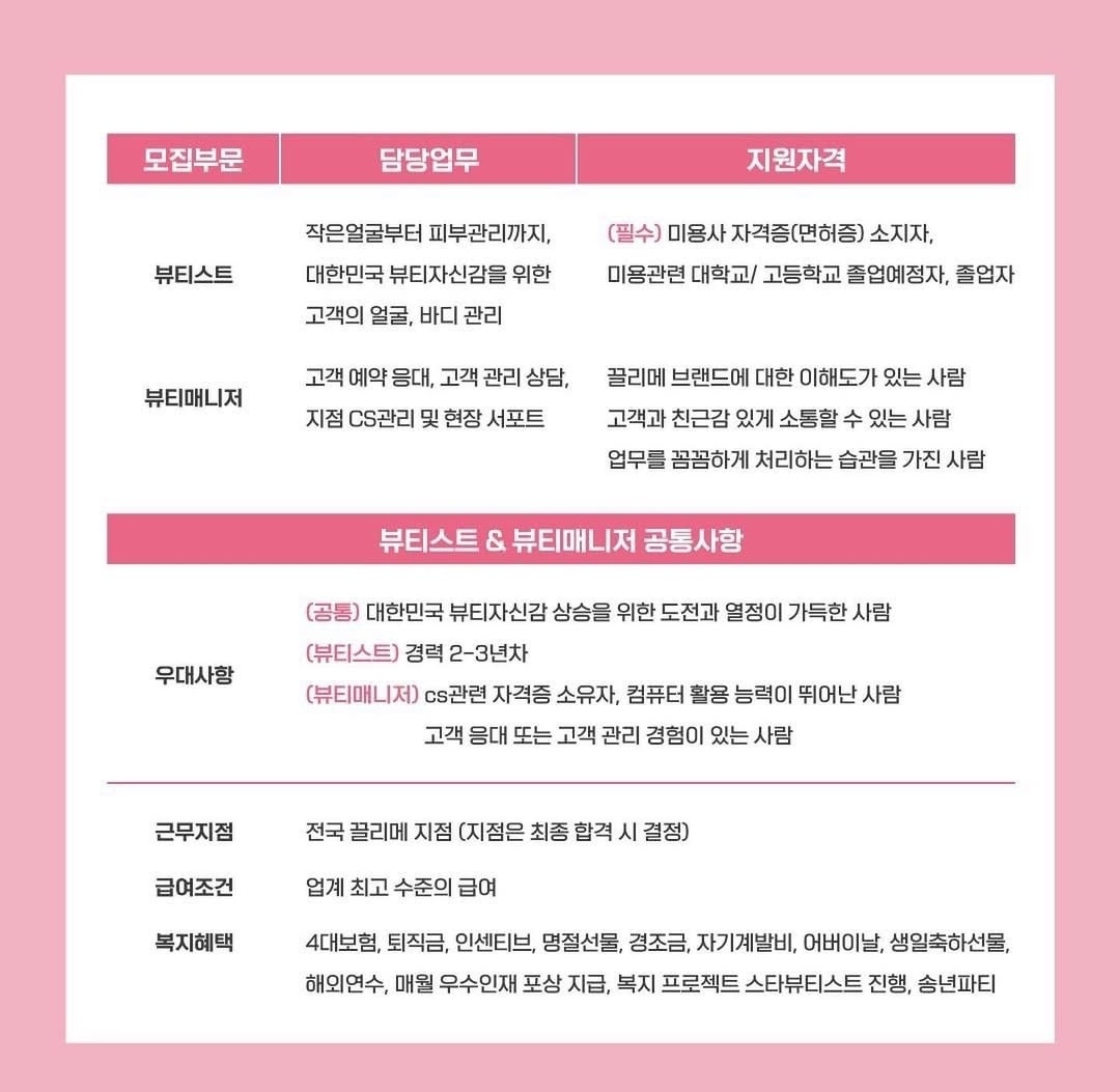 본 정보는 끌리메중앙대점 에서 제공한 자료를 바탕으로 뷰티인잡에서 편집 및 그 표현방법을 수정하여 완성한 것입니다. 본 정보는 뷰티인잡의 동의없이 무단전재 또는 재배포, 재가공할 수 없으며, 게재된 채용기업과 채용담당자의 정보는 구직활동 이외의 용도로 사용할 수 없습니다. 뷰티인잡의 동의없이 무단전재, 재배포, 재가공, 구직활동 이외의 용도로 사용 시 형사 및 민사 법적 책임이 있을 수 있습니다. 뷰티인잡은 끌리메중앙대점 에서 게재한 자료에 대한 오류와 사용자가 이를 신뢰하여 취한 조치에 대한 책임을 지지 않습니다.